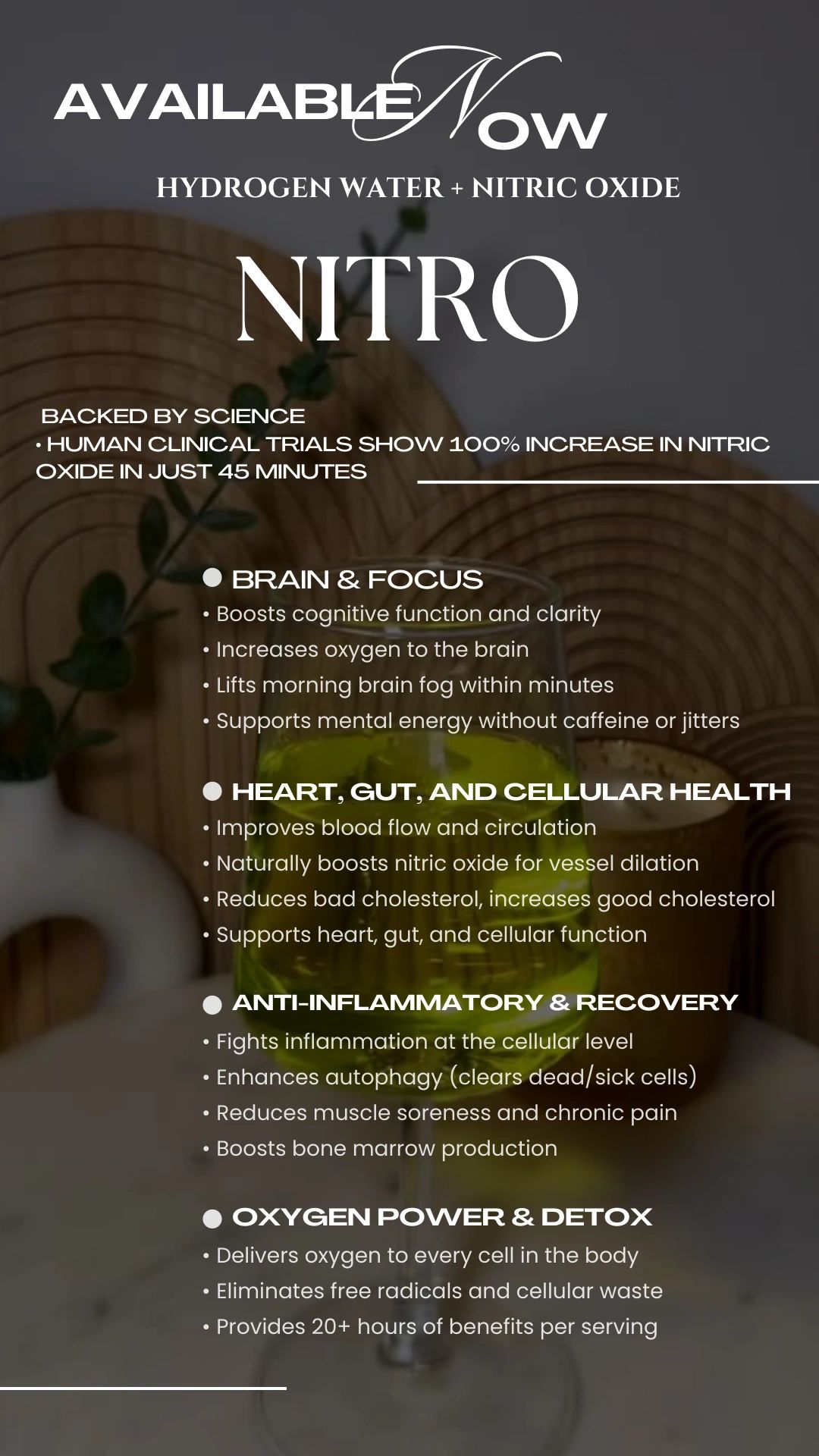 Nitro is a hydrogen + nitric oxide water designed to support your body from the inside out. It’s not a gimmick or a quick fix — it’s a daily ally that helps your body function like it was designed to.